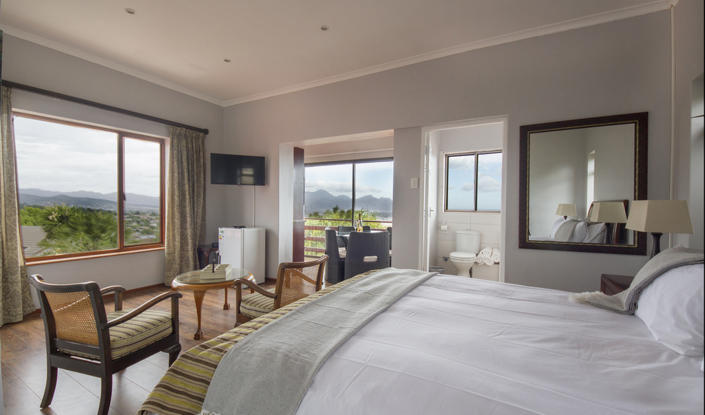 This Suite is situated on the upper level and is our pride and joy, with stunning views over False Bay and the Hottentots Holland Mountain range. There is a private entrance and 1 flight of steps to access the 49 square meter room. The room features a queen bed, an air conditioner, dstv, WIFI, a hairdryer, a small fridge and a microwave. The en-suite bathroom with lovely views has an open shower.